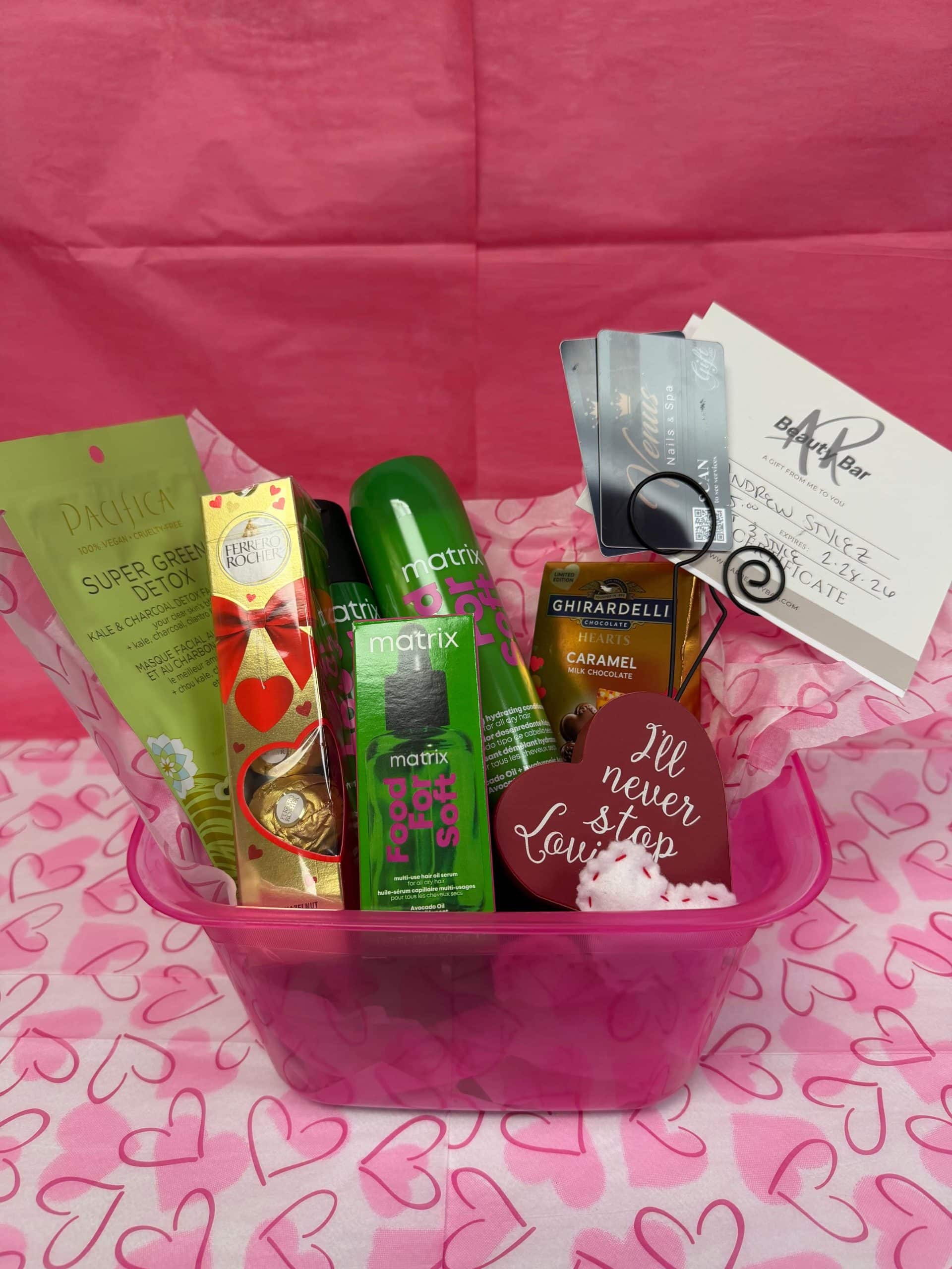 Matrix Food for Soft Detangling Hydrating Conditioner, Matrix Food for Soft Hydrating Shampoo, Matrix Food for Soft Multi-Use Hair Oil Serum, $65 Haircut and style gift certificate, 2 $10 each Venus Nail gift certificates, Ferrero Rocher chocolates, Ghirardelli Caramel Milk Chocolate, face mask. Donated by Andrew Stylez at AR Beauty Bar