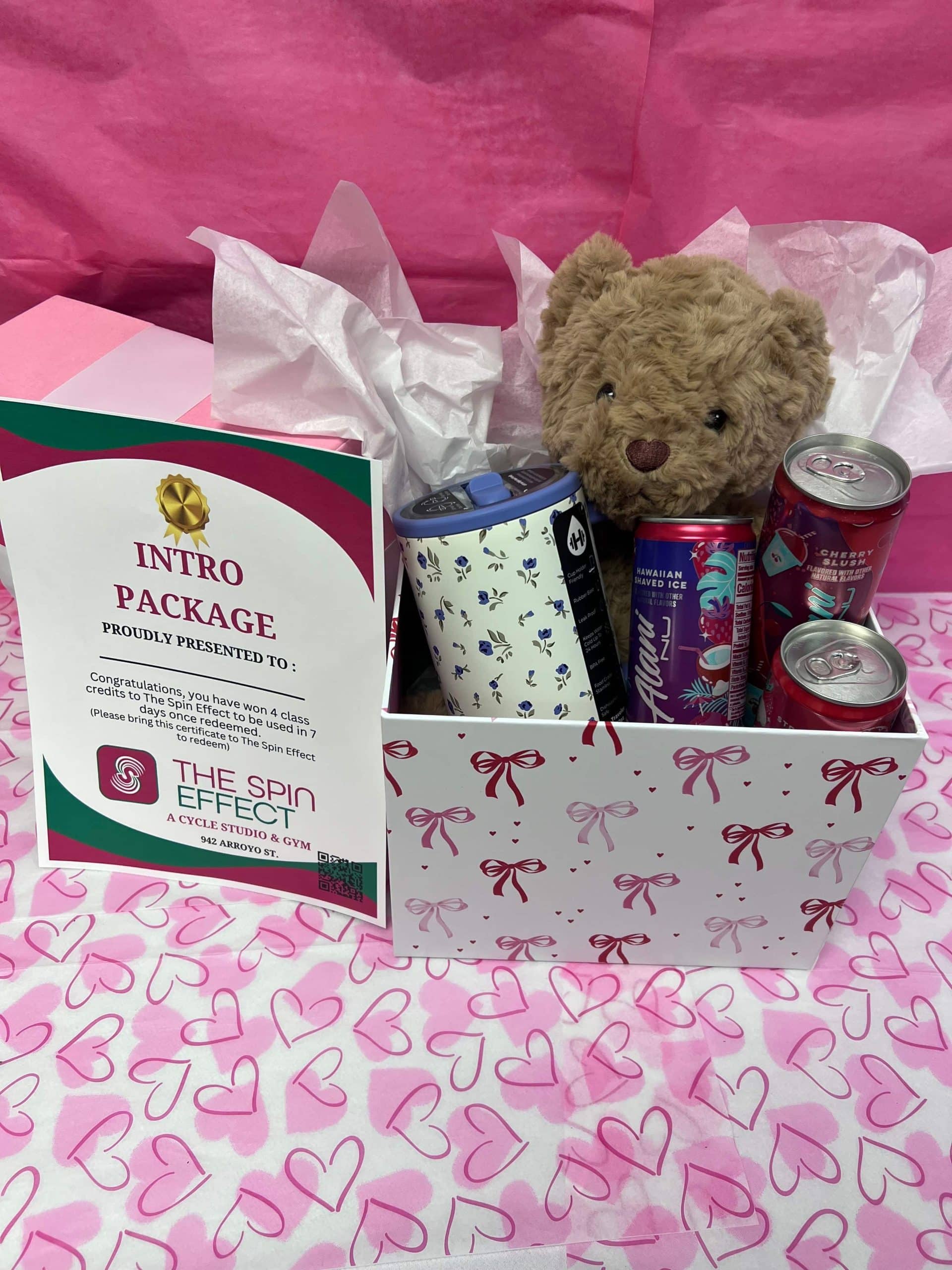 Spin Effect 4 Free Classes (must be used within 7 days), Hydrojug 32 oz, Plush Teddy Bear, Alani Strawberry Sunrise energy drink, Alani Cherry Slush, Alani Hawaiian Shaved Ice. Donated by Spin Effect