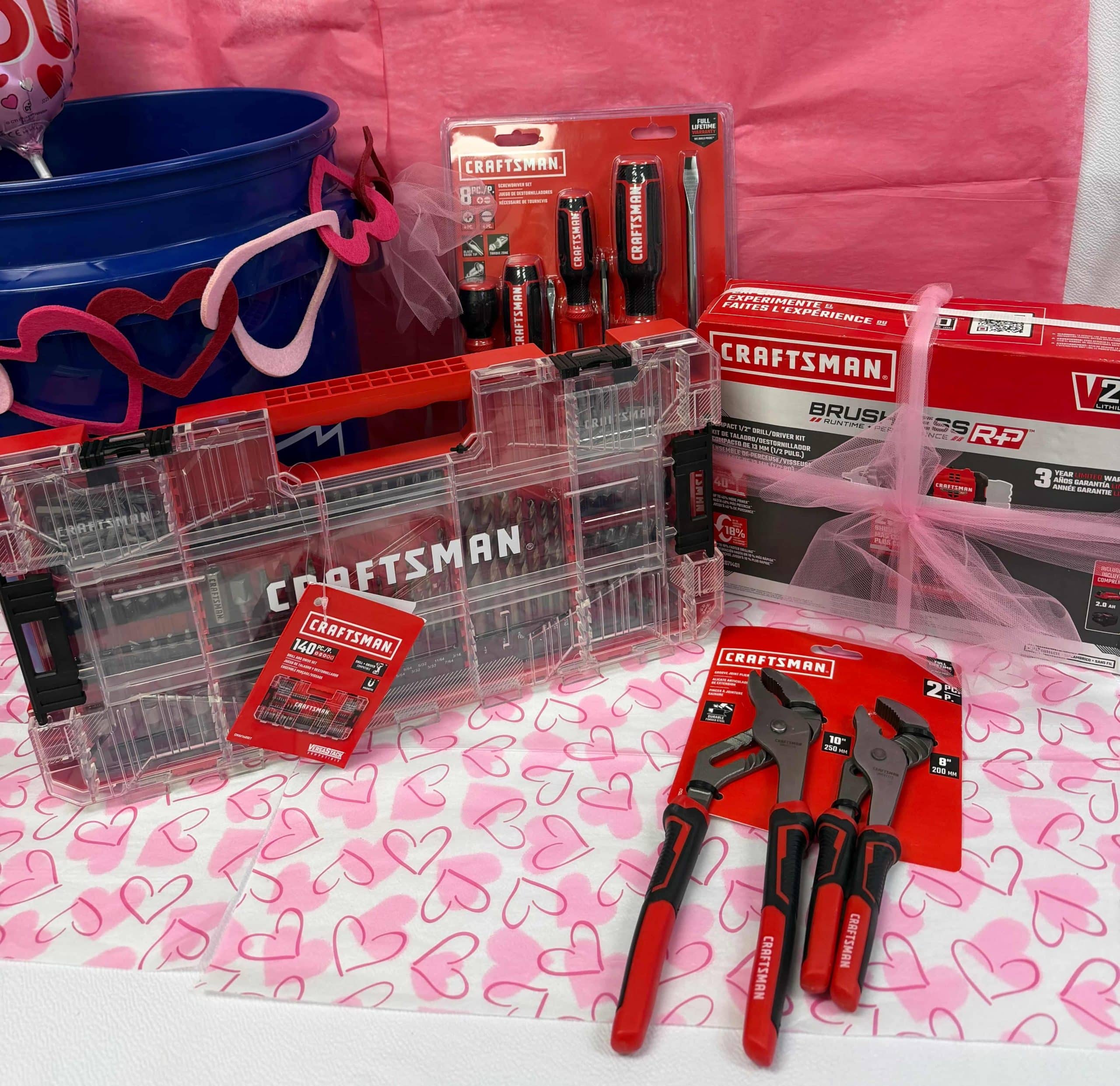 Craftsman 140 pc Drill and Drive Set, Craftsman 8 pc Screwdriver set, Craftsman Compact ½” Drill/Drive Kit, Craftsman 10” and 8” Pliers, Lowe’s Plastic Bucket. Donated by Lowes