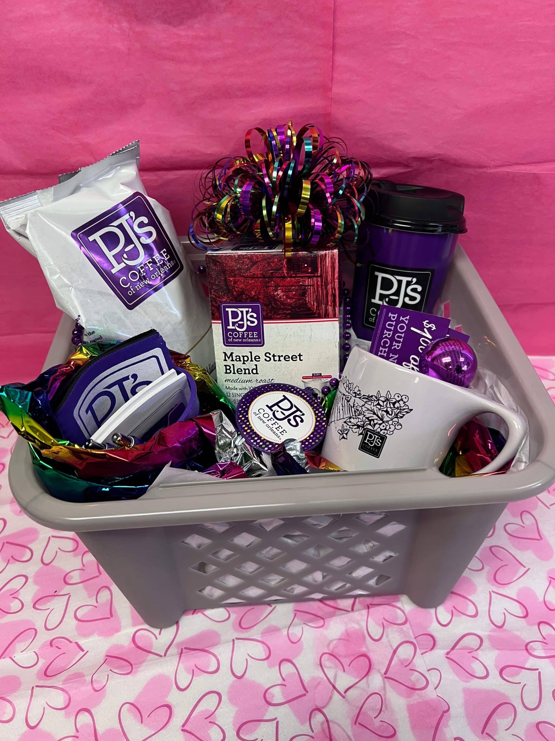 PJ’s Maple Street Blend Medium Roast Coffee Cups, PJ’s Coffee Sothern Wedding Cake Whole Bean Coffee, Assorted PJ’s Merch, PJ’s Coffee Mug, lip balm, 2 $1 off Vouchers. Donated by PJ’s Coffee of New Orleans