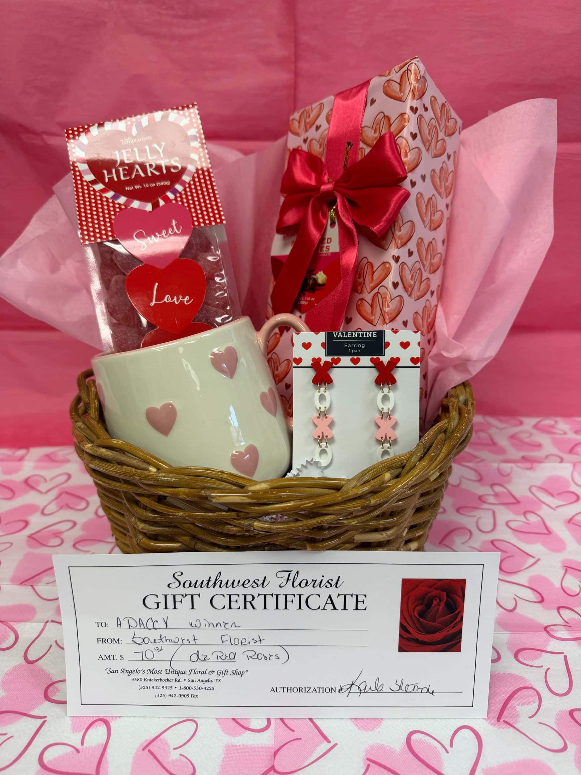 XOXO Earrings, Little Temptations Jelly Hearts Candy, Gift Wrapped Assorted Pralines, White Mug with Pink Hearts, Southwest Florist Gift Certificate for a Dozen Red Roses ($70 Value) Gift Certificate Donated By Southwest Florist