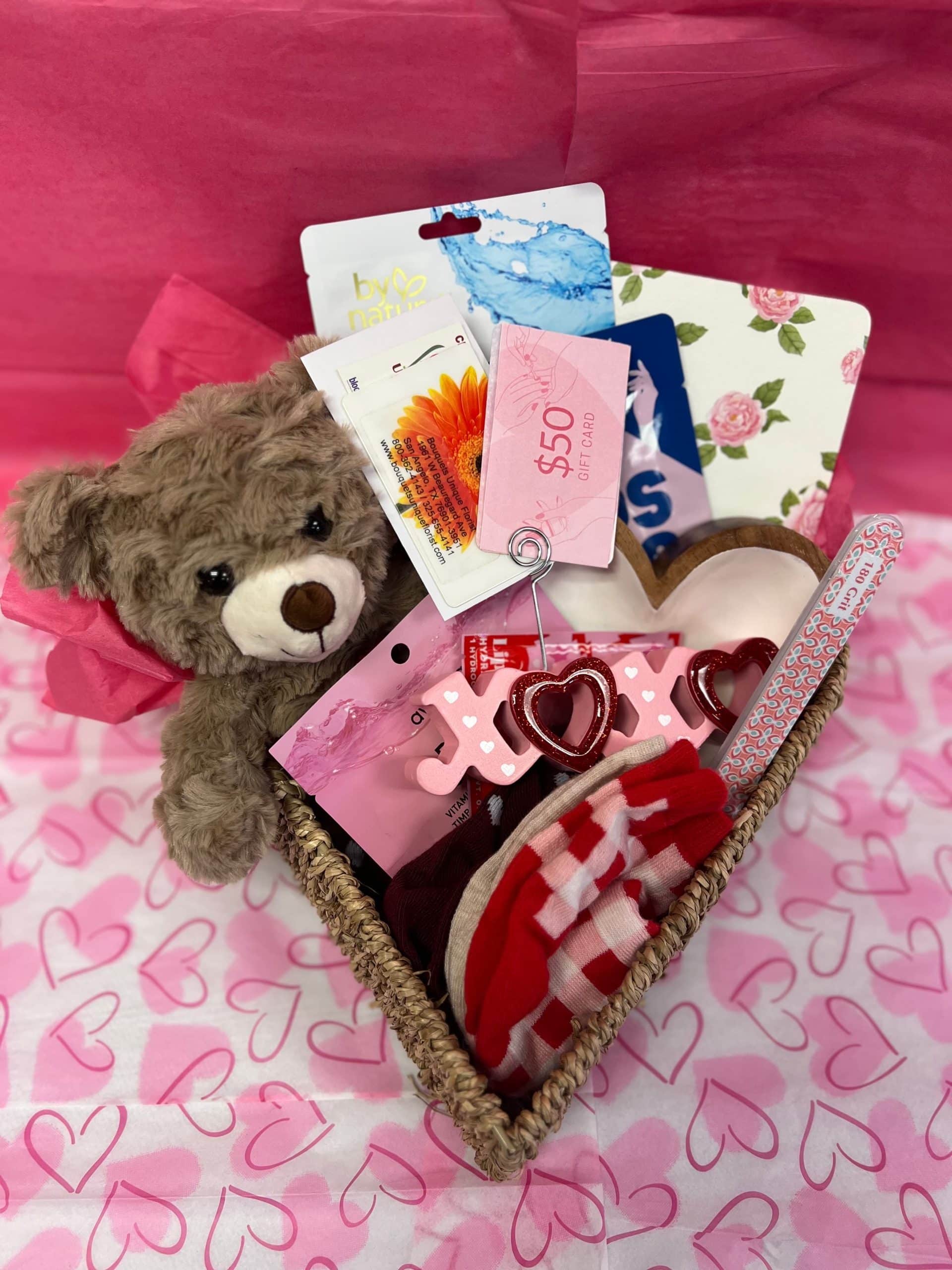 $95 Gift Certificate to Bouquets Unique Florist, $50 Gift Certificate to Royal Nails, Journal, Valentine Socks, Nail File, Lip Mask, Eye Gels, Foot Mask, Hyaluronic Acid Face Mask, Teddy Bear, Heart Shaped Trinket Bowl