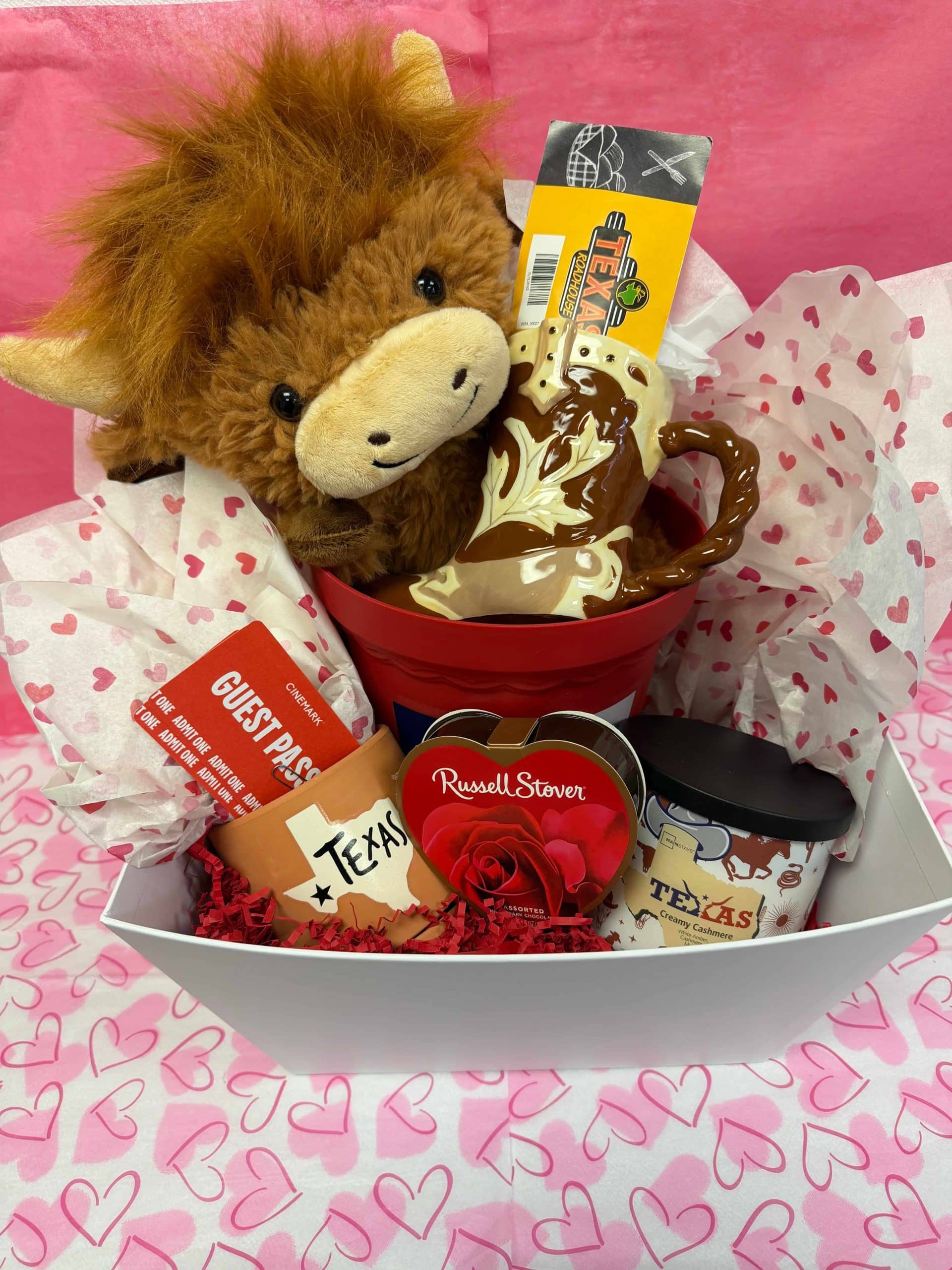 Dinner for 2 up to $30 Texas Roadhouse Gift Certificate, Western Boot Mug, Texas Red Pot, Plush Animal, Texas Creamy Cashmere Candle, Russel Stover Chocolates, Texas Terracotta Mini Ceramic Pot, 2 Cinemark Guest Pass Vouchers. Gift Certificate Donated by Texas Roadhouse