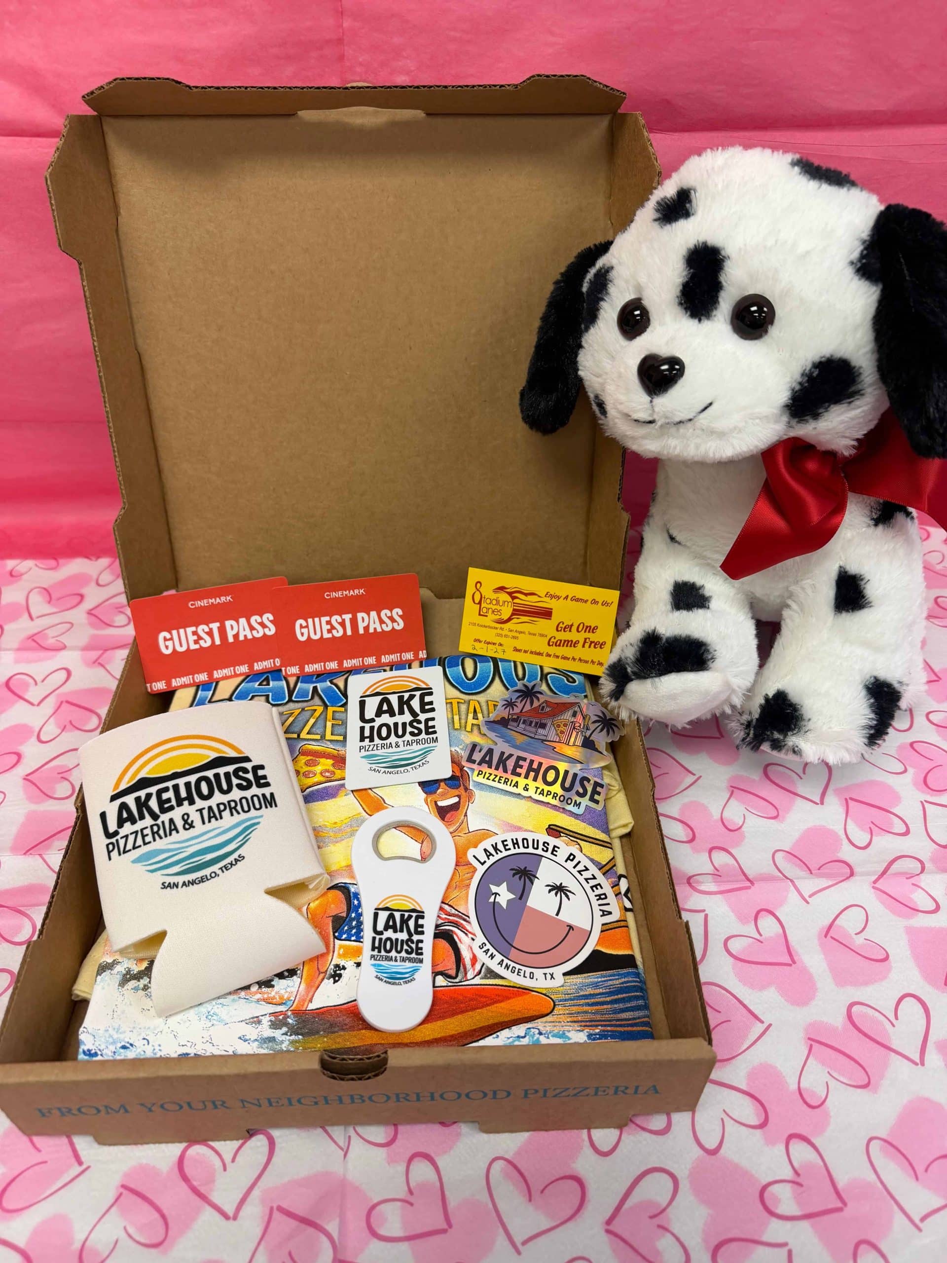 $20 Lakehouse Pizzeria & Taproom Gift Card, Assorted Merch (Koozie, bottle opener, stickers, Lakehouse T-shirt Size Large, Dalmatian Plush Animal, 2 Cinemark Guest Passes, 3 Stadium Lanes Get One Game Free vouchers. Donated by Lakehouse Pizzeria
