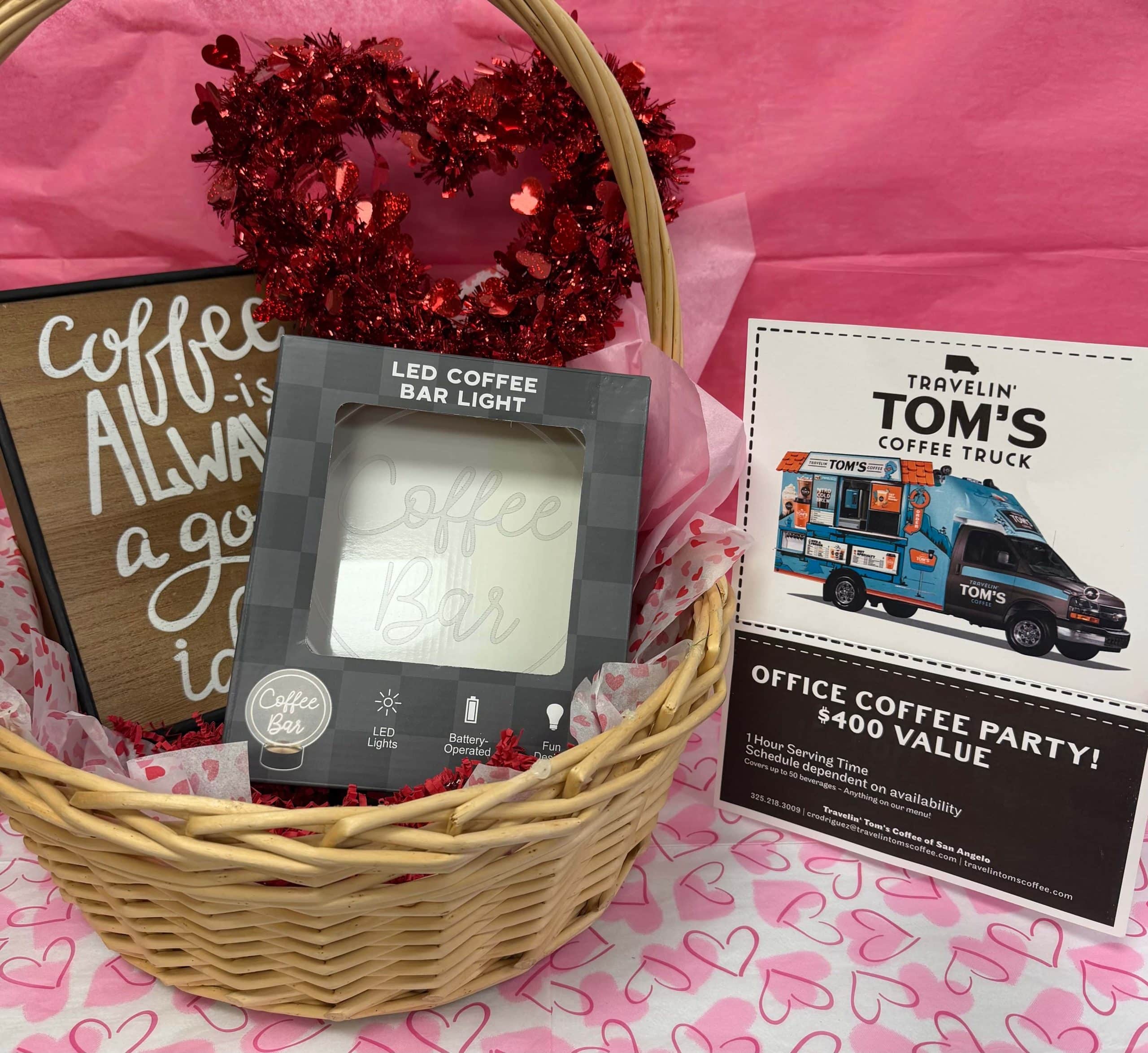$400 value Office Coffee Party Voucher for 1 Hour Serving Time (Covers 50 beverages!), LED Coffee Bar Light Décor, Box of Chocolates. Office Coffee Party Donated by Travelin’ Tom’s Coffee Truck