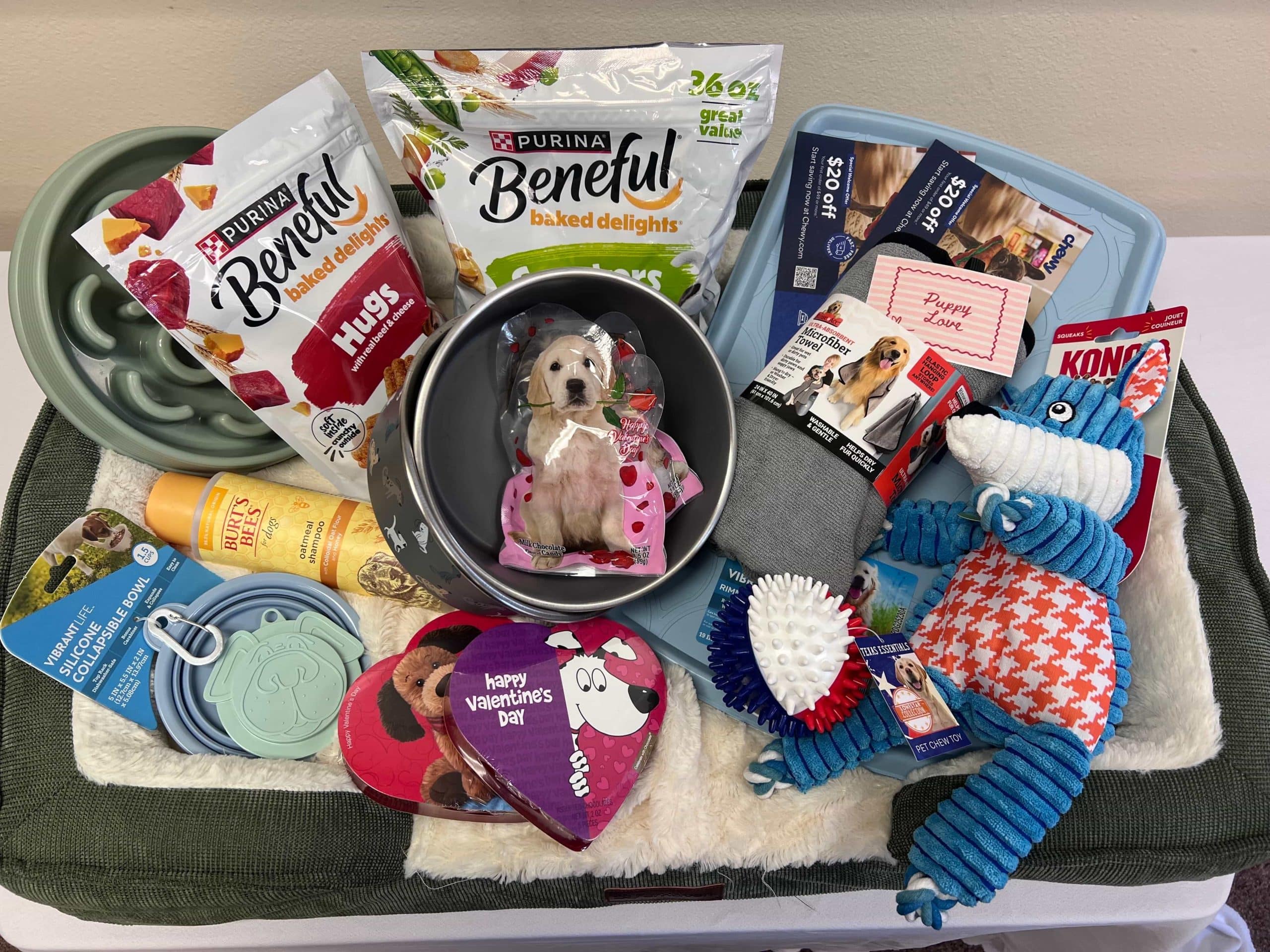 Dog Bed (Medium sized), Burts Bees Oatmeal Shampoo, Dog Slow Eating Bow, 2 Dog Bowls for food and water, Silicone Collapsible Bowl, Can Cover, Purina Beneful Hugs, Purina Beneful Snackers, Dog Toys, Food and Water Mat, Microfiber Towel, Flavored candy, Box of Chocolates, Vouchers for Chewy. Donated by ADACCV Direct Care Specialist Team