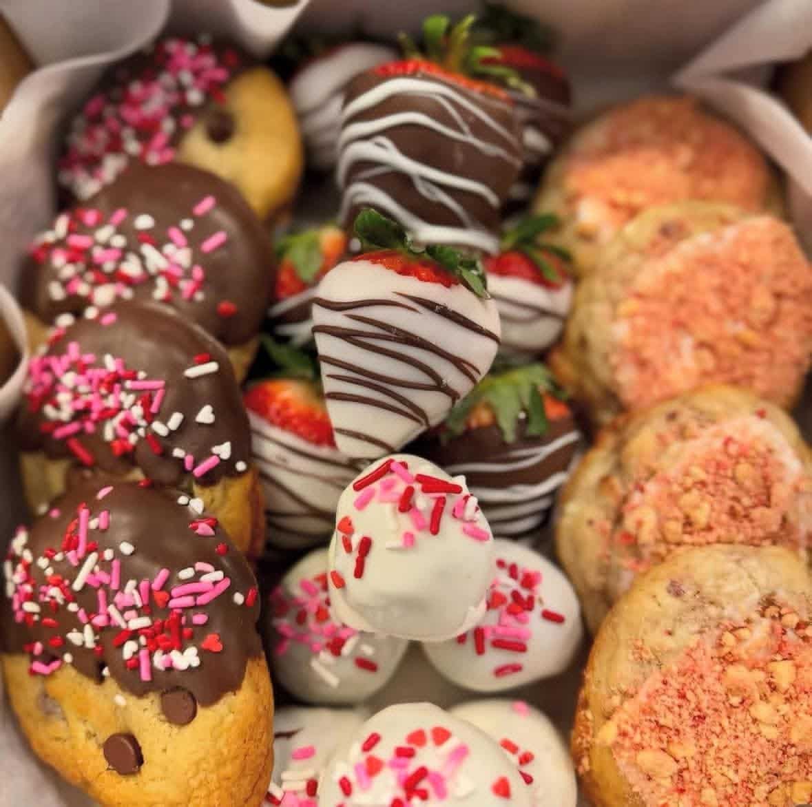Dipped Chocolate Chip Cookies, Chocolate Covered Strawberries, Oreo Truffles, Strawberry and Cheesecake Cookies. Donated by Sugar High Bake Shop